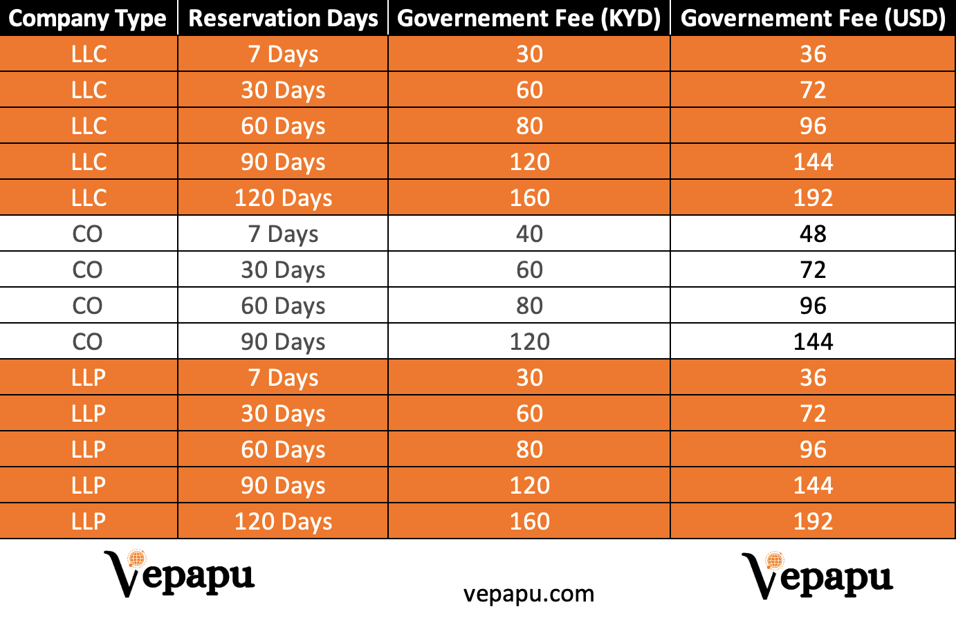 For company name reservation for your Cayman Islands, the government fee is USD 72 for 30 days reservation, USD 96 for 60 days reservation, or USD 144 for 90 days reservation. Please refer to the below chart for a detailed understanding.